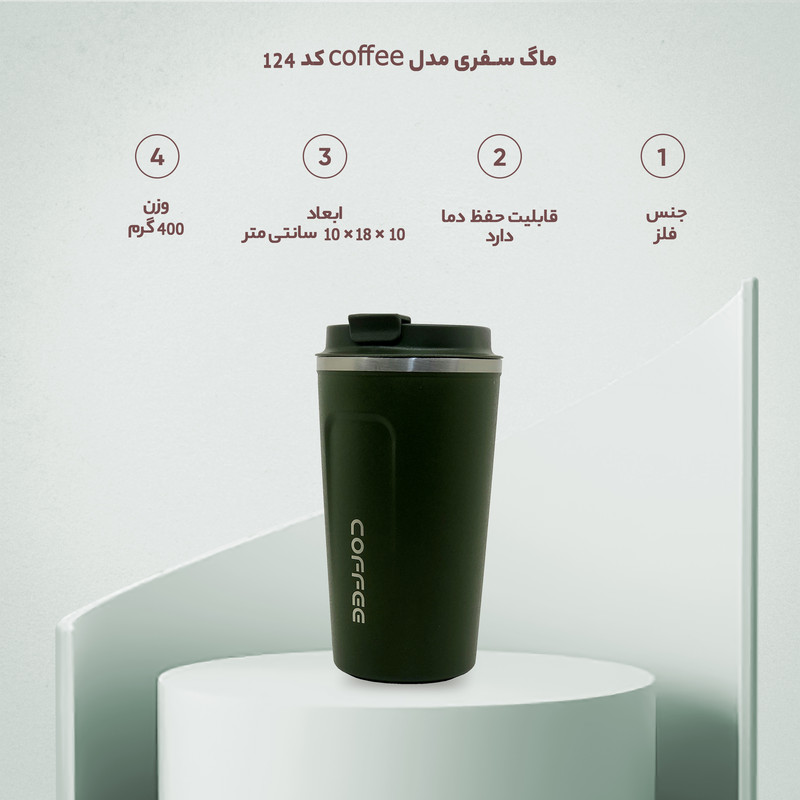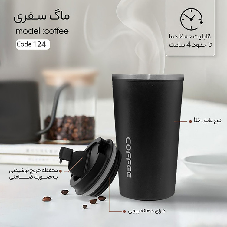 اگر جز افرادی هستید که به نوشیدن انواع چای و دمنوش و قهوه علاقه دارید و روزانه چندین فنجان نوشیدنی مورد علاقه خود را میل میکنید استفاده از ماگ برای شما نیاز خواهد بود. ماگ سفری مدل coffee کد 124 گنجایش 0.510 لیتر دارای وزن 400 گرم از جنس فلز بوده و نوع سری آن پیچی است. این محصول قابلیت حفظ دما را دارد و مایع آن به وسیله ضامن خارج میشود. نوع عایق این محصول خلا بوده و شیشه نیست که در اثر ضربه شکسته شود. به دلیل جنس این ماگ شما میتوانید به راحتی آن را حمل کنید و نگران آسیب خوردن آن نباشید زیرا به دلیل جنس فلز بودن آن شکسته نمیشود و نهایتا در هنگام زمین خوردن خط و خش بردارد. نوع سری ماگ سفری مدل coffee کد 124 گنجایش 0.510 لیتر پیچی است که به همین دلیل دچار نشتی نمیشود. با استفاده از ضامن این محصول میتوان به آسانی از آن استفاده کرد.